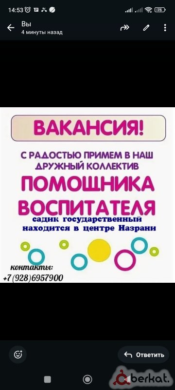 В наш дружный и тёплый коллектив требуются: Повар • Няня (помощник воспитателя) Главные требования - любовь к детям, ответственность и чистота во всём. Опыт приветствуется, но не обязателен - главное желание работать и заботиться о малышах! • Работа в стабильном и доброжелательном коллективе. По всем вопросам звоните: 8-928-734-77-99