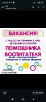 Требуются: воспитатель и помощник воспитателя в государственный садик г. Назрань. Звонить по номеру 8928 695 79 00.