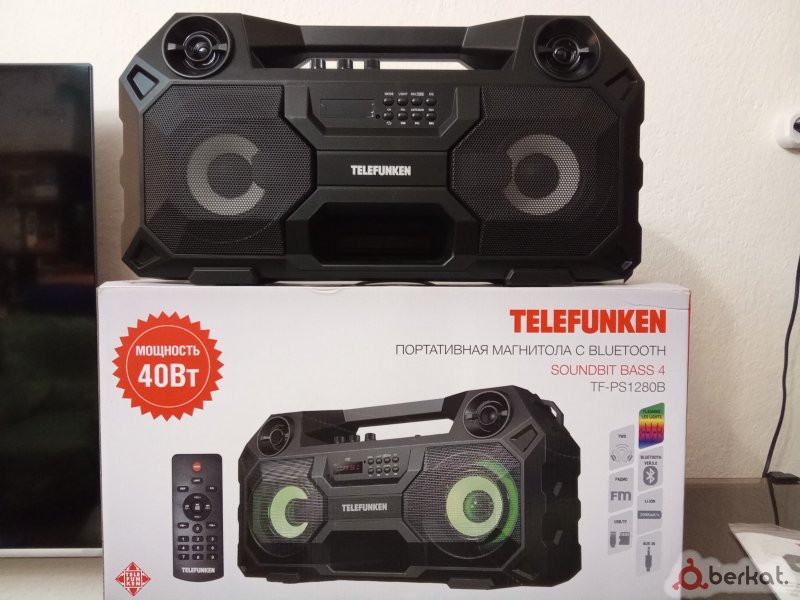 Новая магнитола в упаковке,от немецкой фирмы Телефункен.Размер не маленький,приличный.Радио,флешка,блютуз,Аукс,Цветомузыка,эквалайзер и т.д.Мощность звука 20+20=40ватт чистейшего качественного стерео звука.Работает как от сети,так и встроенного аккумулятора,зарядки хватает на долго.Можно брать и на природу.Классная вещь.